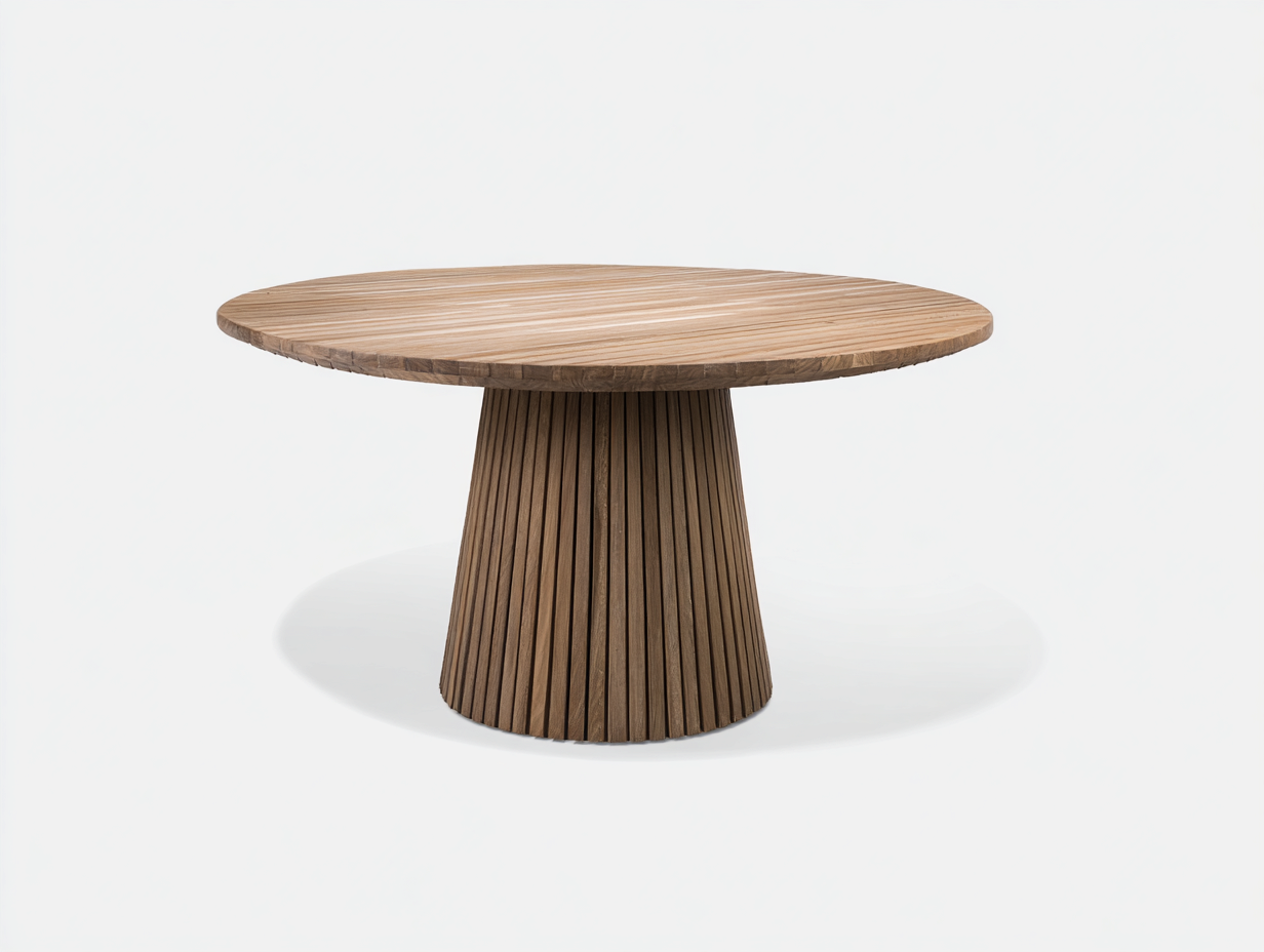Crafted from solid wood with a brown finish, the table features a carefully finished surface and a structured pedestal base designed for outdoor environments.